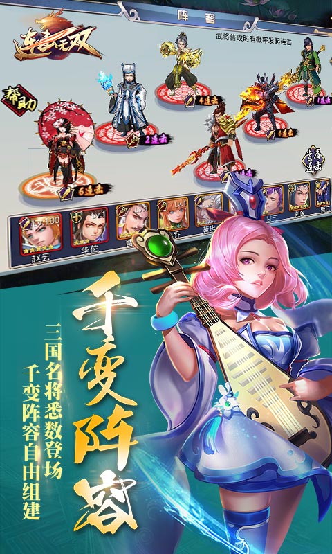 游戏冲破传统卡牌的操作禁锢,加入打击感极强的连击战斗模式,通过技能的配合释放,玩家可以打出华丽非凡而又充满破坏力的技能COMBO,富有冲击力的光晕与VR3D般的碎屏特效相融合,为你的感官带来超强震撼体验,令你纵情享受指尖上的操作快感!同时,通过武将阵容的调配,玩家能产生出多达千种技能组合,并产生千变万化的连击特效,犹如打街机一般爽快淋漓!