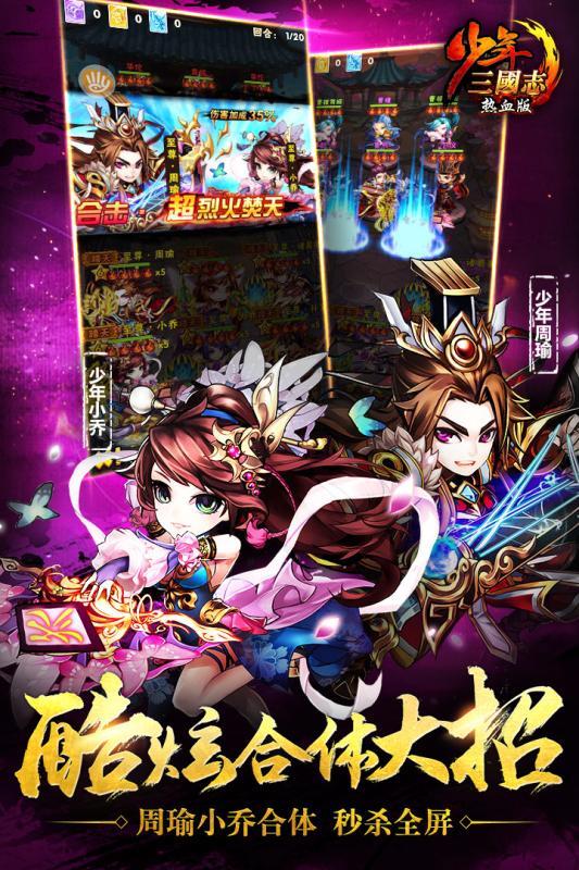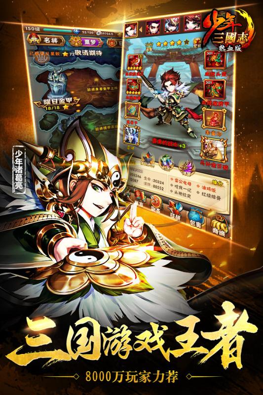 8000万玩家力荐,跑男陈赫天天都在玩!《少年三国志》迎来全新资料片:传世名将。上古名将首次加入三国战场,与荆轲、王昭君、刘秀一起成就霸业!新玩法:“纵横天下”上线,6万格沙盘大地图再掀战场风云。全新跨服语音,即刻集结万人攻城!视觉效果全面革新:知名画师操刀,颜值爆表! 酷炫合体大招,爽到碎屏!欢庆两周年,福利再升级:首周送50000元宝,橙将赵云、红将周瑜、全新战宠免费送!即刻加入全球8000万