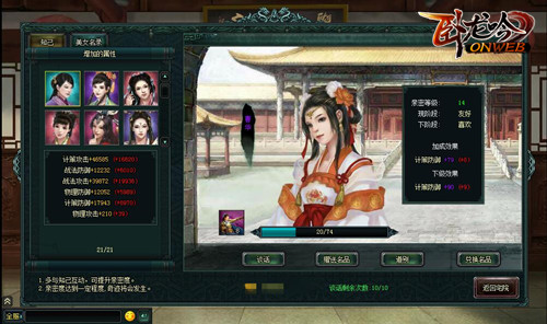 北方有佳人,绝世而独立。一顾倾人城,再顾倾人国。江山如诗,美人如画,自古美女配英雄。三国乱世,英雄辈出,也盛产佳人,而在游奇《卧龙吟》中,有这么一个神奇的地方,在这里,你可以偶遇佳人,可以喜结连理,可以生儿育女,这就是《卧龙吟》的府邸系统,在这里,你可以成就光辉一生。在游奇《卧龙吟》的府邸系统中,你可以外出探寻,并与三国红颜偶遇。在这里,少了沙场杀敌的英煞之气,更多了丝丝缕缕的儿女情长,你会遇到千娇百媚的貂蝉,名闻遐迩的江东二乔,天香国色的邹氏等等三国的传奇女子,并与她们闲聊,从陌生慢慢到熟悉。当下游奇《卧龙吟》中共有36位三国女性NPC,与她们交流增加亲密度,并且结为知己。邵府明珠月露凝,忠心合璧爱方浓。当亲密度到一定的程度,你甚至可以与你所熟知的佳人结婚。内堂在游戏中是玩家结婚后的场所,结婚后,与玩家结婚的NPC会在知己列表里消失,结婚的npc换到内堂界面里出现。当玩家结婚后,妻子的半身像会永久出现在内堂,且也可以和“谈话”和“赠送名品”玩家与妻子的亲密度可以继续提升,这时候的你就可以下一步孩子的问题了,因为在游奇《卧龙吟》中,孩子是有着极大作用的。书塾是孩子学习的场地,自古英雄出少年,游奇《卧龙吟》中也不例外,不论你有多强的武将,培养一个十全十美的孩子上阵总能够为你解决后顾之忧。而培养孩子最重要的就是修行和觉醒顿悟,有意思的是,游戏中,不但有着选择武将导师指导孩子的过程,更还加入了孩子性格的以及修行特殊事件的额外影响因素,因此让每一个孩子最后培养出来的属性效果都各不相同,这也让书塾系统更充满乐趣和选择性。可以迎娶佳人,可以培育后代,战场厮杀之后,不妨回到这个温馨的港湾享受天伦之乐吧。游奇《卧龙吟》是一款大型战争策略型游戏,并同步支持网页,安卓,苹果用户同服一争高下。《卧龙吟》带你回到群雄并起的三国时期,感受最纯粹的古代战争。此款绿色游戏能让你体会到前所未有的游戏体验,运筹帷幄,决胜千里,只要你有毅力,普通玩家也能称霸。一骑当千的历史名将,彼此克制的各系兵种,属性随机的神兵利器,都将是你争霸天下的制胜筹码。