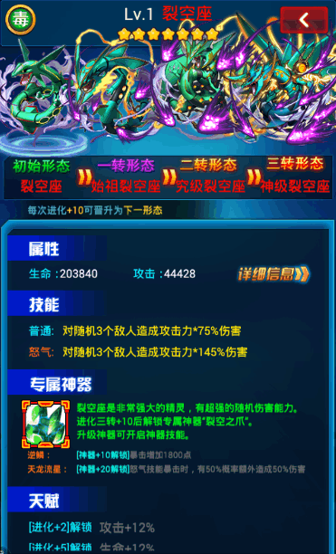 中秋节,又称月夕、团圆节。相传,嫦娥偷吃了后羿的不死之药后,飞到月宫。但琼楼玉宇,高处不胜寒,只有口袋妖怪联盟里的裂空座陪伴。裂空座作为《口袋妖怪联盟》里老一代神兽,但是因为“开服活动”抽奖方式的更新,使其易得性大幅度提升,并且由于其较强的作战能力,裂空座再一次火了起来,成为小资玩家甚至平民不可多得的对战、推图利器。 基本属性 生命:203840 攻击:44428 暴击:1280 闪避:600 技能 普通:对随机3个敌人造成攻击力×75%伤害 怒气:对随机3个敌人造成攻击力×145%伤害 裂空座属于随机散杀精灵,并且具有较高的生命和攻击。另外由于其独特的暴击+闪避加成,这使裂空座有着天生出众的作战+续航能力。(暴击+闪避双重加成在普通七星精灵中,只有鲤鱼王和由基拉才有)。 对比其他老一代神兽可以发现,裂空座的“攻血比”(攻击属性值÷生命属性值)是非常高的。强大的随机三输出再配上天生就不差的生命属性,使得裂空座在作战中的发挥有着较高的稳定性,这对于玩家而言也非常容易上手——毕竟裂空座没有走两个极端,单攻或全体型攻击的输出;并且不论是用于玩家对战还是推图,都没有太过特殊的要求和限制,样样通吃。
