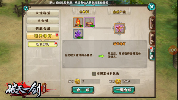 今年的国庆中秋喜相连,不知各位侠士是否已经蠢蠢欲动准备放假了呢?《破天一剑》手游中,为了迎接众位侠士一同欢度佳节,共庆团圆,也是准备了许许多多丰厚的礼物盒精彩的活动。究竟是什么新的宝贝闪亮登场,又有哪些惊喜福利呢?快来一起看一看吧!这个宝贝可不简单,想必很多人都听说过阿拉丁神灯,只要擦亮神灯就能满足人的愿望。江湖之中自然也有这般神器秘宝——破天神灯强势降临,据说里面有许多让人朝思暮想的神秘道具,3-6级各种类宝石、PK7宝、各种颜色钥匙、1-8级天运秘籍、心法卷轴、千血酒、金币、各类神珠等珍贵道具,你一定不要错过。想要神灯,不如自己亲手铸造一个吧!铸造神灯需要三种道具,水晶碎片、灯芯还有神火。水晶碎片可以从神秘副本中得到,灯芯则可以从屠魔副本和许多BOSS的身上获取,至于神火嘛,自然也需要击败强力的BOSS获得。不过就算侠士运气不佳,也可以从商城里进行购买哦。想必神灯已经让你蠢蠢欲动了吧,欢度华诞,神灯大狂欢。活动期间每个区服玩家开启神灯达到一定数量,就将开启一次全服奖励!恰逢佳节自然要喜气热闹,谁说只有过年才能放鞭炮?国庆中秋八天乐,焰火礼包等你拿,醍醐灌顶丸、破天爆竹、绑定元宝大放送。不负初心,感恩回馈送大礼,国庆期间充值排行在列的玩家,将有机会获得海量宝石、千血酒、还有专属称号让你倍显尊贵。除此之外,每天在线都可以领取三倍经验丹,还等什么,快来破天狂欢吧!双节送喜气,过节添福气,快来《破天一剑》手游,过一个充实快乐的佳节吧!