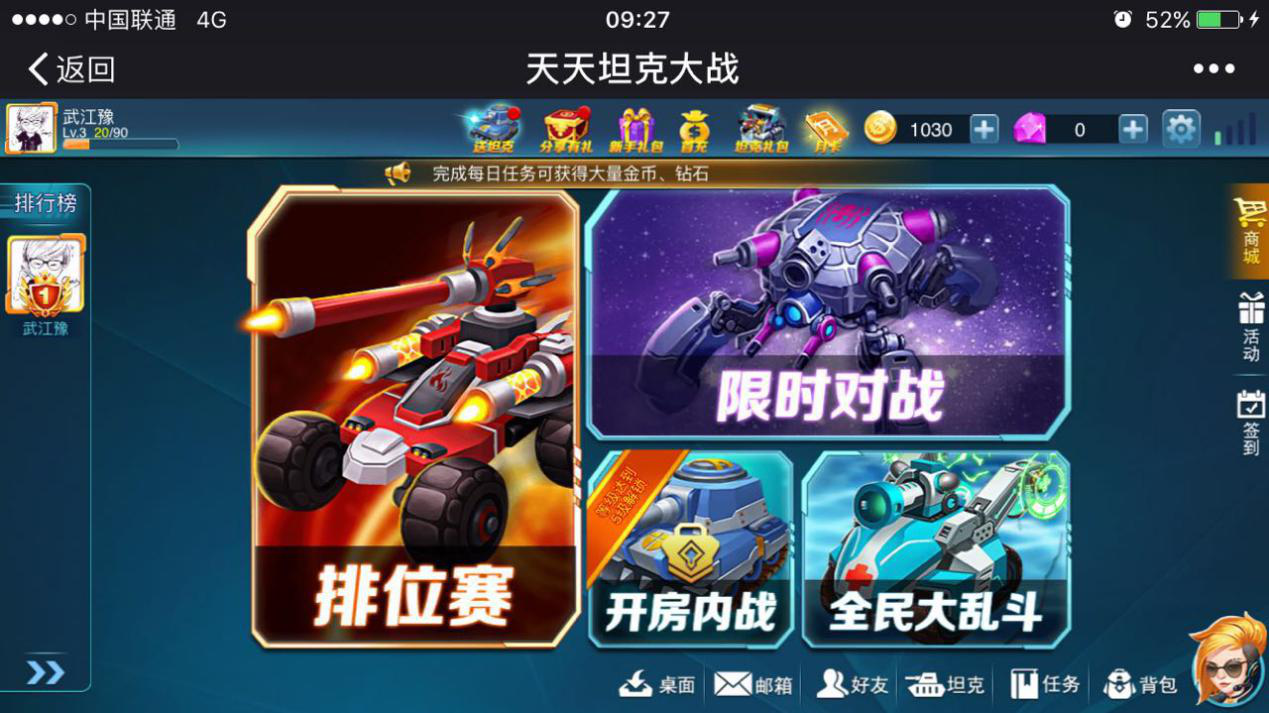 小编玩过很多坦克类型的游戏,各有各的风采。今天小编为大家说下指尖MOBA 《天天坦克大战》试玩体验。首先为大家介绍下游戏都有哪些玩法:排位赛,限时对战,全民大乱斗,开房内战。总共四种玩法。PvP玩法,非常不错。游戏最多人数为6人。该游戏最主要注重的是游戏的操作性以及团队性。登陆游戏之后可以玩两种玩法,除了(开房内战和全民大乱斗)之外有等级限制,其他两种玩法都可以直接进入。【排位赛】是3V3的对决,获得胜利需要更好的团队配合,以及选择适合团战的坦克。小编只身一人试了一把排位赛,可把小编坑苦了,队友完全不跟我配合,自顾自的,就像打LOL时候,团战爆发队友不跟团,导致一波团灭,很气~有没有?就是这种感受,虽然游戏输了让小编不开心。不过游戏内亮点有两处。第一处:双方可以抢夺地图中间的研究所,研究所可以帮己方或者敌方攻击炮塔,从而能更快的结束战斗。第二处:每杀死一个敌人会随机掉落一件道具,利用好每一个道具可以助你超神~【限时对战】是3v3的对决,双方人头数多的一方获胜。在一个大地图中,击杀小兵(坦克)获得道具,在配合队友的助攻,小编的个人能力展现出来,各种超神,从而取得了游戏的胜利~~【全民大乱斗】属于个人战斗,3级解锁。游戏采用的是积分制,初始积分1000,杀人和杀小兵都可以增加积分。不是吹的小编的个人能力可是很强的,人称“草丛杀手”。因为我就喜欢在草丛里终结对手。要不是没有出去找人小编绝对第一~~,当然了 玩这款游戏只有杀人才能体验乐趣。还有重要的一点,小兵也不能忽视,打小兵可以获得道具哦~另外还有一个模式就是【开房内战】,各位玩家可以叫上你的三五好友,一起来玩耍,一局游戏最多可邀请5人,体验基友间对战的快感!将你的小伙伴按在地板上摩擦!之后小编又继续玩了几把,总体来说:小编玩的很开心,不管是在团队中,还是个人竞技中各种超神,操作简单易懂,几分钟一把战斗,对战中可以从远处,或在接近空隙的地方攻击敌人,躲避敌人的炮弹---所有的这一切会让你沉醉其中,身临其境。