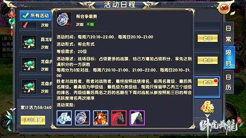 《卧虎藏龙贰》全新帮派资料片“王者归来”将于9月28日震撼上线。此次全新资料片,不仅为玩家带来全新天下第一玩法和帮会争霸赛,更有全新帮会联盟系统上线!同时准备了海量帮派福利活动等待所有玩家,与帮会兄弟一道,感受全新卧虎情义江湖!【热血鏖战 帮会争霸赛点燃激情】帮会争霸赛活动是《卧虎藏龙贰》中一个全新开放的玩法,是一场为双方帮派之间对抗的群体PK活动。帮会争霸赛在每周周六晚上20点10分开放,设置了甲、乙、丙、丁、戊、己、庚、辛、壬、癸10个联赛级别,每个联赛级别最多有8个帮会参战;帮主和副帮主可选拔本帮内的优秀之士与其他帮派进行对决。在比赛中占领更多的战旗,给己方增加占领积分,率先达到满积分的一方获胜。参与角逐之后获得胜利的帮会除了可获得丰富的银币、帮贡等奖励之外,更可获得专属稀有坐骑皮肤。【单挑之王 勇夺天下第一】如果说帮会争霸是一群人的狂欢,那么谁与争锋便是一个人的鏖战。全服王者玩法我们可以把它看做是《卧虎藏龙贰》中的个人排位赛,与帮会争霸赛一样,都是证明自己实力的最好途径,文无第一,武无第二,是英雄豪杰,就来全服王者积分赛的舞台上战个痛快。全服王者积分赛每周一至五开启,开启时间内可以进行实时跨服匹配,参与全服王者积分赛的玩家会获得一个初始的分段,点击活动面板中的匹配按钮即可进行1V1的匹配,匹配成功后在规定时间内战胜对手即可获得积分,每次击败对手后自己的基础分就会上升,相应的排位也会上升。每周统计一次积分,积分排名前列的玩家将有资格进入晋级赛。晋级赛最多进行6轮(视参赛人员变动),战胜对手即可获得胜利,每一场晋级赛无论成功与否都会有一定数量的银币奖励。胜场最多的前16名玩家可以获得十六强礼包,胜场最多的八名玩家将获得晋级决赛的资格。全服王者决赛将采取三局两胜制,获胜的一方除了获得打孔石等奖励之外,还将获得“少年王者”的全服王者活动称号与专属王者时装,所以说,参加全服王者是证明自身实力的最好途径。除了帮派玩法和个人玩法的丰富之外,此次更新还更加完善了系统的一些小功能,包括改名卡、赠送功能等方面的完善。喜爱江湖的你,可一定不要错过《卧虎藏龙贰》这一次全新资料片上线哦。关于《卧虎藏龙贰》《卧虎藏龙贰》是由北京神奇时代网络有限公司开发,阿里游戏2017独家发行的动作武侠3Dmmo大作!产品除了延续了一代的经典玩法,还进行了全方位多维度创新升级,给你一个熟悉又刺激的江湖!千万玩家,伴你一起追寻武侠梦!不是所有武侠,都能称之为江湖!写实3D人物设计,高清细腻的精美场景,开启全新mmo动作武侠之旅!
