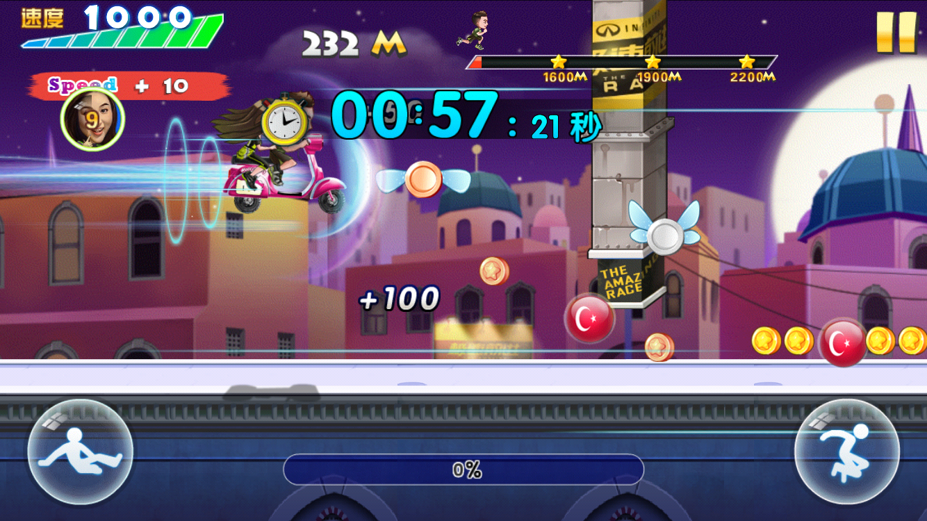 超级大咖云集,全明星阵容,深圳卫视真人秀节目《极速前进》正版授权手游《极速前进—全明星跑酷总动员》邀你一起极速开跑!延续了节目中真实刺激的游戏风格,《极速前进》跑酷版加入了PK玩法、无尽模式等紧张刺激的跑酷玩法,更有坐骑爱宠,游戏搭档助你畅快跑酷。多重乐趣多重体验,极速之旅,等你开启! 欢乐跑酷 大咖同行与大牌搭档亲密接触,一同开启跑酷之旅是《极速前进—全明星跑酷总动员》的游戏特色之一。《极速前进》节目中的各位游戏玩家们,在《极速前进》跑酷版游戏中化身玩家的跑酷伙伴,与玩家并肩前行,一起躲障碍,收金币,给玩家带来不一样的跑酷体验。 火热PK 同屏乱斗《极速前进》跑酷版,在传统跑酷玩法的基础上,加入了火热的PK模式。玩家与明星伙伴一起同屏激战,战斗升级,酷爽翻倍! 坐骑爱宠 欢乐助跑除了明星伙伴之外,《极速前进》跑酷版中还加入了炫酷坐骑和超萌爱宠为玩家的极速之旅增添乐趣体验。坐骑爱宠在手,可以体验到金币加成,速度翻倍的感觉,咱们坐骑爱宠们可不是只有长的好看哦,论实力,也是妥妥的呢。 多样场景 玩转全球《极速前进》节目在各个国家玩游戏,做任务,《极速前进》跑酷版也不甘落后。游戏中设置了多个场景,土耳其站、澳洲站、法国站…不同的游戏环境让玩家环游世界、玩转全球再也不只是梦想啦!快来和明星伙伴们一起,开启你的极速之旅吧!
