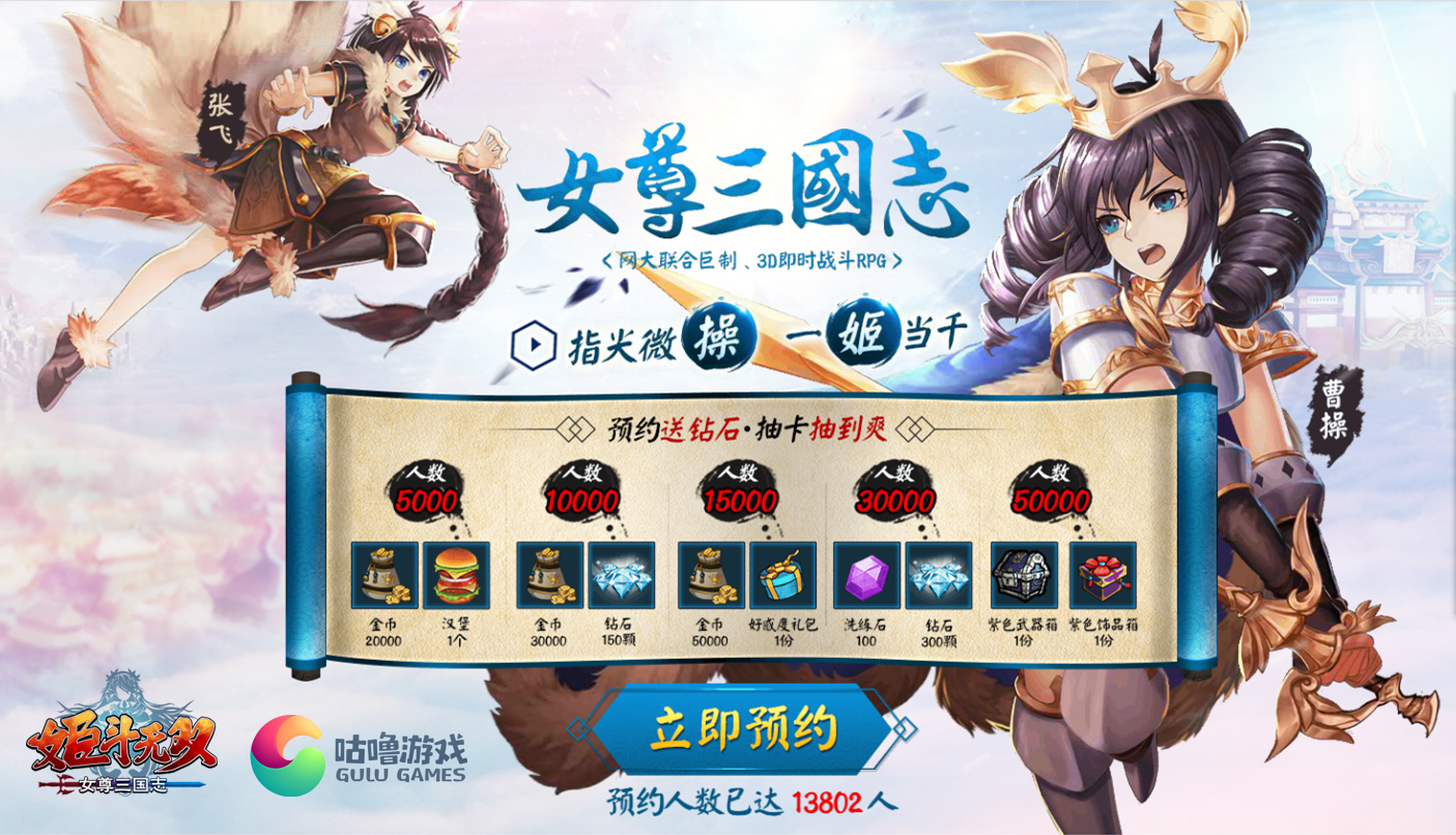 萌娘三国即时战略手游《姬斗无双》官网预约现已开启!参与预约即可获得丰厚游戏奖励,让你在萌姬养成之路上快人一步,在征服天下的征程中所向披靡!快点击官网加入预约游戏的大军吧~【预约成就·五档奖励】在《姬斗无双》官网http://jdws.gulugames.cn/的预约界面我们可以看到,本次公测的预约奖励一共分为五档,分别是预约人数达到5000时解锁的“金币*20000,汉堡*1”、预约人数达到10000时解锁的“金币*30000,钻石*150”、预约人数达到15000人解锁的“金币*50000,好感度礼盒*1”、预约人数达到30000解锁的“洗练石*100,钻石*300”以及最后预约人数达到50000人解锁的“紫色武器箱*1,紫色饰品箱*1”。所有福利均为预约限定,只有预约人数达到了上述要求,参与预约的各位才能够获得相应档次的礼物。因此参与了游戏预约的各位一定要记得扩散给身边的朋友,让他们都来参与游戏预约,以期获得更多的福利哦~【精锐装备·披荆斩棘】这次《姬斗无双》的官网预约奖励中,除了总计价值45元人民币的钻石礼包外,最为关键的就是最终预约人数达到50000人解锁的紫色武器箱和紫色饰品箱了。饰品和武器在游戏中都属于中后期才能大量获取重点培养的游戏道具,因此在前期很长的游戏时间里,这样一套紫色的装备套装能够为你心爱的萌姬武将的战斗力提供巨大的加成。可以说是在游戏前期极大提升队伍实力、方便推图的利器,想要体验更加畅快的游戏过程的玩家绝对不容错过。【丰富内容·尽在官网】除了推出预约功能,《姬斗无双》官网还提供了海量的游戏资讯,包括了游戏公告、游戏新闻、游戏活动、游戏攻略、武将介绍、和游戏同人专区,玩家只需要打开官网就可以将游戏相关的海量资讯一网打尽,轻松上手。在官网的同人专区还覆盖了游戏线下活动相关的图文信息,包含美女玩家福利照片等大量养眼内容,在游戏之余看看各种游戏周边的花边趣闻、美女玩家,也可以大饱一份眼福。【关于《姬斗无双》】《姬斗无双》是由上海游吟网络科技有限公司研发,上海晨之科旗下咕噜游戏发行的一款综合了角色养成、冒险闯关、竞技PK等丰富游戏内容的3D触屏动作手机网络游戏。玩家在游戏中作为一名现代青年,在机缘巧合下穿越到一个不太一样的三国时代,这里所有的三国武将竟然全部变成了女性!?玩家要帮助三国豪杰们击败强敌,收集伙伴,培养萌妹,共同战斗。一边战斗一边修正这个错乱的时空,并寻找返回现代的办法。