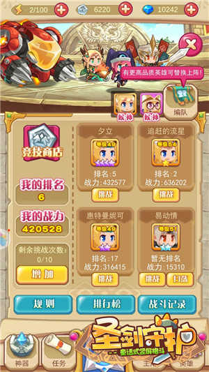 《圣剑守护》是一款追求华丽战斗与竞技荣誉的童话竖版格斗手游!竞技场是玩家每天都要去的地方,与普通副本打怪任务不同,竞技场是玩家之间实力的比拼。这里高手云集,无数玩家向战力的顶峰攀爬,每个人都有一战封神的梦想!无操作风险 只看硬实力!《圣剑守护》的竞技场采用自动操作的模式,玩家不用手动战斗,不能手动释放技能与奥义。所以玩家在竞技场中不用担心操作失误,这里是AI对战,只看玩家的硬实力!最强整容登场 战斗编组有技巧竞技场允许玩家派出主角、2位英雄以及一款坐骑参战,随着玩家的等级提高还可以有2名候补英雄助阵。选择自己的战队时,优先选择战斗力高的英雄和坐骑,如果战斗力相近,可以针对对手选择属性风格相克的英雄,这样可以获得额外的战力加成。每日结算奖赏 强者俞强排名靠后的玩家击败靠前的玩家,就可以与其互换位置。《圣剑守护》每日都会结算的竞技场排行榜,排名越高的选手,可以获得越多的的钻石和荣誉徽章。钻石用途多多,游戏中就是真金白银。荣誉徽章则是可以在竞技场商店购买各种道具,其中包含竞技场商店特有的高级装备和稀有英雄之魂,能让弱者变强,强者俞强!