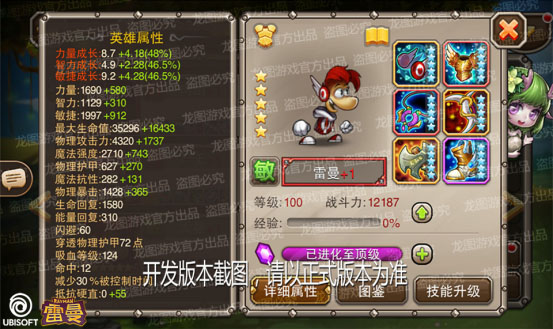 7月,育碧授权英雄再临,灵巧的雷曼将在传奇大陆上留下光辉的足迹!传奇大陆一年一度的全明星长跑节正式开幕。英雄们都在努力奔跑,小冰冰离终点还有2公里时,心想今年要创纪录了!就在这时,后方传来惊呼声,一位陌生的参赛者,奔跑姿势铿锵有力,直接用跳跃的方式过人,这神级表现令众人折服。小冰冰还没反应过来,他已在终点处摆出了超帅的POSE!面对这匹突然杀出的黑马,众人瞠目结舌,只见大屏幕显示:“1st 雷曼”。【属性介绍】95级博学院,100级红1满装满附魔属性作为前排物理系英雄,力量和敏捷属性卓越,物理攻击力和物理暴击在同类英雄中相当出众,穿透物理护甲属性让他的输出更上一层楼。优秀的生命回复和吸血能力使他在战场上更持久地翻江倒海。配合高闪避和减控属性的支持,雷曼在场上更加来去自如,活蹦乱跳的他既能帮助队友缩短控制效果持续时间,又能在敌人阵中拳打脚踢,施放各种控制技能,不停地骚扰敌方的进攻节奏。雷曼灵巧的身影即将遍布传奇大陆的各个角落。此外,雷曼享受以下加成:1.丛林系——享受仙女龙觉醒技能加成,可获得生命值上限提升【技能介绍】蓝色拳套(大招):雷曼获得蓝色拳套的力量,在普通攻击及蓄力飞拳时,拳套会协同攻击。再次释放还会强化为红色拳套,威力更强并附带灼烧效果。蓄力飞拳(普通):雷曼通过蓄力打出更远更强力的一击并击退敌人(蓄力期间免疫控制效果)。小心脚下(普通):雷曼在敌人头顶多次跳跃,造成伤害及短暂眩晕,最后落地时对周围敌人造成伤害并击飞。跳跃次数越多,落地伤害越高。心之力(普通):雷曼小心脚下技能施展多次后,会获得一颗心(每场战斗中有获取次数限制)。免疫下一次受到的致命伤害,恢复部分生命并无敌一小段时间。蓝色拳套:雷曼获得蓝色拳套的力量,在普通攻击及蓄力飞拳时,拳套会协同攻击;再次释放还会强化为红色拳套,威力更强并附带灼烧效果。蓄力飞拳:雷曼通过蓄力打出更远更强力的一击并击退敌人;蓄力期间免疫控制效果。小心脚下:雷曼在敌人头顶多次跳跃,造成伤害及短暂眩晕;最后落地时对周围敌人造成伤害并击飞;跳跃次数越多,落地伤害越高。心之力:雷曼小心脚下技能施展多次后,会获得一颗心;心在每场战斗中有获取次数限制;免疫下一次受到的致命伤害,恢复部分生命并无敌一小段时间。【站位介绍】作为前排物理系输出,雷曼站位位于前排偏后的位置。开场时,雷曼可以在前排强力坦克的防护下,尽可能减轻敌方首轮攻击&控制技能的干扰,舒适地打出自己的第一发击退重拳。随后雷曼将在敌阵中来回跳跃,影响敌方技能的正常施放,并用强悍的拳脚凶狠地教训敌人。雷曼多次跳跃后将获得一颗心,它能为雷曼抵御一次致命伤害,并获得短暂的无敌时间和部分生命值的回复,这一强力的自保技能为雷曼肆无忌惮的进攻增加保障。此外,雷曼通过鼓舞士气,为队友减少控制时间,使团队的进攻更加流畅。灵活的雷曼即将搅乱队长大大们的排兵布阵,面对他的强势骚扰,你准备好了吗?★★出世即觉醒★★雷曼长年累月磨炼自己的拳脚从而获得觉醒能力!队长大大们只要将他培养到90级橙,即可开启他的觉醒之旅咯~~觉醒图:觉醒技能:鼓舞:雷曼的技能会影响到其范围内的友方单位,减少眩晕、沉默、缴械、定身及恐惧效果的持续时间。觉醒装备:雷曼觉醒装备——飞羽耳麦,敏捷的提升使雷曼的拳脚更加犀利,生命值和物理护甲的提升让雷曼可以更持久地在战场上大显身手。觉醒之旅:觉醒之旅第一站:队长大大们可以在第17章精英副本-神明遗迹中收集雷曼的觉醒材料;觉醒之旅第二站:雷曼参与完成任意预言之池难度5或以上,2次;觉醒之旅第三站:雷曼参与完成精英关卡:第14章-龙语,且无人阵亡,1次。【小剧透】1.乱拳出击——雷曼的拳法相当了得。蓄力飞拳直接将敌方击退并造成沉重的伤害,跳跃到敌阵中后时而勾拳、时而直拳更是让对手眼花缭乱,难于招架。大招状态下,拳套变为蓝色,拳术变得更加精湛,第二次施放大招时,拳套升级为红色,炽热的拳法将更无情地折磨对手。2.满场骚扰——雷曼矫健的步伐令人难以捉摸。雷曼的小心脚下技能,在敌人头顶蹦了蹦去,把敌人耍的团团转,最后一跃更是造成可观的范围伤害,并砸散敌方阵型。可不要认为雷曼这么跳是在立死亡Flag,施展多次小心脚下技能后,雷曼将获得免死心的护佑,抵御一次致死伤害,延续自己的战斗力。3.减控能手——雷曼觉醒后将为队友提供振奋人心的精神鼓舞,在雷曼技能覆盖范围内或施放路径上有友方单位,则队友会获得一定的减控增益,这将使己方的进攻节奏更加流畅,增加己方团队整体输出能力,雷曼对整个团队的作用也不容小觑啊!7月27日,育碧授权英雄——雷曼强势侵袭!