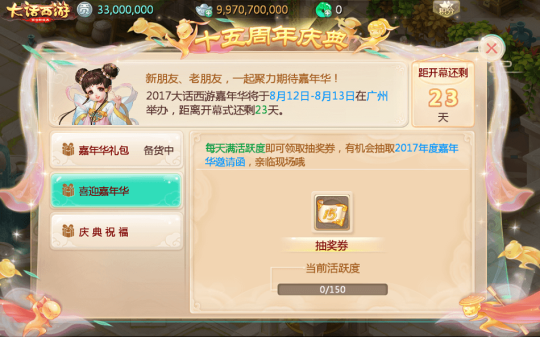 全民狂欢,酷爽一夏!大话玩家的年度狂欢盛典——“2017大话西游嘉年华”即将震撼来袭。明日起,嘉年华门票抽奖活动将正式上线,玩家参与抽奖即有机会免费赢取嘉年华入场邀请函!届时你不仅将能跟大话兄弟欢聚一堂,更有游园活动、巅峰对决PK、靓丽Coser等精彩内容等着你!酷爽一夏 嘉年华门票抽奖活动邀你亲临现场为迎接“2017大话嘉年华”的盛大到来,大话西游手游现已推出“大话暑期庆典”系列福利活动。明日起,“喜迎嘉年华”活动将正式上线,包括嘉年华邀请函在内的诸多惊喜好礼送不停!惊喜多多 嘉年华门票抽奖玩法上线从明日新版本上线至27日5点期间,玩家每完成一项游戏活动后,均可获得一定活跃度奖励。当玩家的活跃度达到当日上限(150点)的时候,便可额外获赠一张“喜迎嘉年华抽奖券”。 此外,明日12:35,大话嘉年华也将再次开启门票礼包抢购活动,一场精彩无限的线下千人狂欢聚会等你来参与!使用抽奖券,玩家将能进入“十五周年庆典”大转盘进行抽奖,奖品不仅包含有一级宝石、盘古精铁、补天神石等游戏好礼,更将有机会赢得“嘉年华邀请函”,获得免费前往嘉年华现场参与狂欢的机会!惊喜多多福利多多,你,想试试手气吗?精彩继续 “神笔马良”活动全新剧情玩法来袭相传天界的神笔遗落人间,被马良得到。妖魔们妄图夺取神笔,借助其魔力在凡间兴风作浪。你必须要击败这些妖魔,救出马良,并让神笔最终回归三界!明日,“神笔马良”活动第二章也将正式与全服玩家见面,你将再次跟随马良一起开启全新的神话穿越之旅,包括童心未泯、藏宝画境等诸多新颖活动玩法等你来体验!(“童心未泯”玩法截图)待新版本上线后,除了开放神笔马良第二部分的剧情任务外,同时还有“童心未泯”、“藏宝画境”两大全新趣味玩法。其中,在“童心未泯”里,玩家需要通过巧妙操作,降服那些喜欢恶作剧的泡泡;而在“藏宝画境”玩法中,大侠们则需要惩治贪婪的胡县令与匪王尤霸,最终解救出被困的马良,开启退还神笔之路。届时,通过该系列玩法,玩家不仅将获得极大的游戏乐趣,更有诸多惊喜奖励等着你!(“藏宝画境”玩法截图)陪伴是最长情的告白 大话嘉年华即将震撼来袭欢乐盛会,精彩无限!8月12日—8月13日,“2017大话西游嘉年华”即将在广州盛大举行!届时,来自全国各地玩家将欢聚一堂共诉大话情义,此外,还有梦回大唐的现场游园会、热血激燃的无差别总决赛、重磅爆料的品牌发布会、高颜值的coser表演等更多精彩内容!大话暑期爽不停,线上线下同欢庆!参与嘉年华门票抽奖活动,一起免费加入这场嗨翻天的嘉年华盛会之中吧,更多惊喜等你体验!更全活动新闻,海量游戏信息,请关注《大话西游》手游官网、官方论坛。
