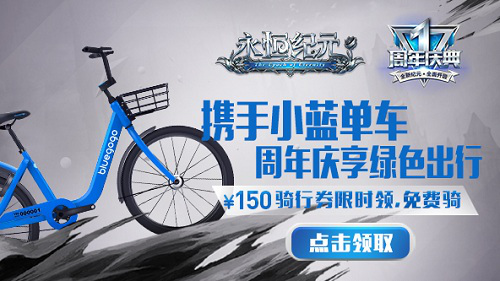 《永恒纪元》7.7周年庆资料片“龙骑士觉醒”精彩开启!在游戏一周年之际,《永恒纪元》将携手小蓝单车,7月8日周年庆当天在广州地区范围内推出免费绿色骑行活动,百万骑行券任性派,免费践行环保绿色出行!全民狂欢同庆贺,为周年庆注入绿色新活力2016年7月1日,《永恒纪元》正式开启不删档测试。随后《永恒纪元》创下的一系列成绩令业界为之侧目,其也当之无愧地成为了“页转手”的标杆之作。此次周年庆典,《永恒纪元》特推出全新资料片《龙骑士觉醒》,新职业开启转职新体验,同时开启新玩法-4v4竞技,新功能-语音直播,新福利全民狂欢,新体验1天300级;邀你来战!值游戏上线一周年并迎来版本大更新,为给玩家们的全新纪元再添新活力,7月8日,《永恒纪元》将携手小蓝单车,在广州全市推出免费绿色骑行活动,不辜负这大好时光,低碳节能生活从出行做起,从我做起,小蓝单车愿意一路陪你同行!百万骑行券任性派,豪礼相送我们来真的此次的异业合作秉承《永恒纪元》一直以来“回馈玩家”的中心理念,福利由线上一路延续到线下!为响应绿色出行的号召,《永恒纪元》找到了共享单车的行业翘楚,小蓝单车,和小蓝单车一起为你包下整个城!7月8日当天,在广州市内点开小蓝单车APP,就能在这个特殊的日子里,全城免费骑小蓝单车,骑到“永恒纪元专车”,还有机会参与活动,赢取《永恒纪元》精美周边!详情前往【小蓝单车广州微信公众号】了解。豪礼相送绝不止于此,下载小蓝单车app,在app内的钱包-优惠券内输入:“永恒纪元”就可以获得价值150元免费骑行券!豪礼相送,我们绝不手软!