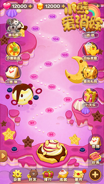《小熊爱消除》是一款六维消除类好玩的手机网游,游戏将于6月30号迎来版本更新。不仅游戏画面更加精美、楚楚可爱,还有极具趣味的“地图奖励”及“每日签到”两项新玩法上线,更多可爱的新周边等你领取哦!【梦幻世界 每张地图都深藏宝藏】在本次新版本中,最有趣的玩法便是“地图奖励”。它不仅满足了处女座玩家的各种追求,更为普罗大众玩家带来了丰厚奖励的气息。自6月30号起,每张地图都将拥有阶段性金牌奖励目标,只要完成就可获得金币。想要了解自己在梦幻世界中各个地图的战绩,只需轻松在章节列表中查看即可。随时查看,随时挑战,每天每位玩家都有5次挑战同关卡次数,通关即可获奖励。无论你是完美控、成就控、奖励控,相信在“地图奖励”中,你都可以最大程度得到满足!【开启新世界的钥匙】新版中,通向梦幻新世界不再是轻而易举。玩家可以通过自己非凡的运气或是碾压众人的智力取胜,获得一把金灿灿的神秘钥匙,只要拥有它,你就可以轻易开启通往新地图的大门。当然还有另一种方法:通过向好友求助,是获得钥匙的捷径,只要集齐10位好友的帮助,你就可联合他们的力量打开新地图,进入新世界!【每日签到 日积月累变身道具大咖】顾名思义,只要你有毅力,从始至终坚持到底,就可以点亮“每日签到”中的所有星星,获得每日奖励以及丰厚的指定奖励。财富与道具的积少成多,就是从每天的“每日签到”开启的。【界面优化 追求视觉系的完美】作为消除界的一股清流,“小熊”不仅首创开辟了六维新玩法,在视觉上更以可爱、呆萌、暖暖爱意的风格赢得玩家喜爱,为更符合当下玩家审美,“小熊”也在不停的修炼“美颜”技巧、优化游戏界面,使自己以更美、更精致的姿态出现在玩家面前!《小熊爱消除》是由龙图发行的全球首款六边形消除手游。获得LINE正版授权,以LINE经典卡通角色为元素,精心设计45个主题章节、超过500个充满奇趣的关卡。分数关、钥匙关、巧克力关……独特的消除方式与华丽的消除特效,带来妙趣横生的挑战和轻松愉悦的成就感。更可与好友互动、挖掘无限惊喜福利,尽情享受休闲乐趣!