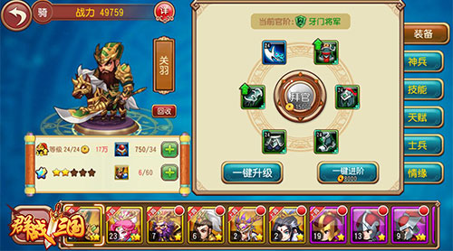 《群战三国》是由万家游戏精心打造的三国题材的国战策略手游,真实还原了三国时期的人事物,想要成为一国之主,加入排兵布阵骁勇善战的三国战场吧。《群战三国》即将不删档内测,国战战火不断,要成就霸业加官进爵就需要通过不断的战斗磨练将士和自己。加官进爵有两个部分:武将官职升职和个人官职挑战。武将升职《群战三国》中武将升职的前提是装备品质的提升,武将升官之后各方面属性都将得到显著提升。装备的品质可分为白色装备、绿色装备、蓝色装备、紫色装备以及橙色装备,装备品质越高武将战力越强。个人官职不经过国战的考验,何以证明自己的实力,所有个人官职的提升要通过层层挑战才有机会实现。官职品阶从九品到一品再到君主,通过挑战的形式进阶,只要达到官职挑战条件,就可以消耗挑战令挑战上一级的其他玩家。作为官员即可拥有特殊权限,获得君主官职的玩家,上线享有全服提示的特权;获得一品以上官职的玩家,国战期间可以使用召唤令;获得九品以上官职的玩家,可在世界频道发言享有官职前缀和每日俸禄的奖励。如果连续3天未参加国战,则会被贬为平民。《群战三国》即将不删档内测,养兵千日待此时,来和我一起培养武将加官进爵,一同攻城略地,征战沙场吧!关于《群战三国》全民橙将,真正的卡牌策略游戏!所有的顶级武将和顶级装备都能在游戏内获得,即有诙谐搞笑幽默轻松的剧情,又有真实还原三国战争的千人国战。多样的布阵方式,多兵种的军团排列,还原真实历史的百余座城池,让玩家真正能够体验到三国时期群雄争霸,战火连篇的战斗快感。24小时国战战不停,等你来玩哦!