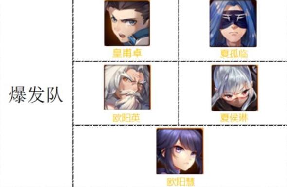 仙剑奇侠传五神级爆发队伍阵容搭配推荐小编已经整理好了,现第一时间把仙剑奇侠传五神级爆发队伍阵容搭配推荐分享给大家。希望由小编所提供的这篇攻略玩家朋友们喜欢,也希望能对大家有所帮助,下面就请大家一起跟着小编去看看吧。神级爆发队伍本阵容过于暴力,请慎重对待!夏侯琳和夏孤临、黄埔卓、欧阳英、欧阳慧下面来简单介绍下这套阵容的每人个别技能介绍、以及获得方式:卓叔属于综合型战士,一般放置前排能输出能肉,特色技能以罡制敌,受到攻击后,有几率反击目标,概率附加眩晕效果并移除目标身上的增益。天道正气,施展怒攻后,增加双防,并移除自身减益效果。伙伴里上阵一个林未央,激活情愿,增加仙、物防14%;(林未央可以通过第三章第一关卡获得,免费的呦)获得产出:抽卡很大几率可以获得卓叔,在开服活动中,抽卡的时候可以招募积分,等招募积分达到一定额度,可以免费更换一张卓叔很划算的,平常可以在魂玉商店自动刷新或者手动刷新得到皇甫卓碎片;夏孤临属于物理输出战士,出其不意斩敌之首;特色技能长离剑意,对目标一列造成大量物理伤害,有50%的几率在发动一次攻击。长离震魂使目标流血。锋锐剑意生命低于百分比10.1%后,可以直接斩杀,没看错哦,是直接斩杀,当然这个百分比可以根据技能等级的提升来提升的;伙伴里上阵一个林未央,激活情愿,增加生命14%;获得产出:同黄埔一样,可以抽卡几率获得,开服活动招募积分兑换,以及魂玉商店获得;夏侯琳仅次欧阳慧的爆发流刺客,对于残血收割很强势,连击时暴击后排残血可以瞬秒;特色技能影袭杀机,瞬间出现在目标身边,以凌厉的剑招直袭目标,对单体目标造成大量物理伤害,(多段伤害,看脸,运气好,触发10连击,基本上没跑了,瞬秒),目标生命越低伤害越高。追魂杀影,三星技能初始增加暴击率20%,击杀目标后追加一次相同攻击,(如果正好影袭杀机击杀目标,那么相当于技能重置了,会随机攻击一名地方英雄)。夺命影刃,追魂杀影的追击次数无上限限制,追击伤害提升20%(伤害随着技能提升增强);伙伴里上阵一个夏侯茗,激活情愿,增加攻击11%(夏侯茗可以通过客栈招募获得,材料卡抽到几率很大)。黄埔、夏孤临、夏侯琳三人同时上阵,夏侯琳、黄埔可以激活情愿,增加生命21%,夏孤临可以激活情愿,增加攻击17%。获得产出:客栈抽卡几率获得、魂玉商店自动、手动刷新,出现夏侯琳的几率很大以及演武商店百分百可以购买。欧阳英前排格挡型战士,能肉能输出,可不是吹的,打我不疼还反伤,想想都难过。混元万剑落,对敌方前排造成大量伤害,释放技能后可以获得持续一回合50%格挡能力。剑意之垒,格挡攻击时会对目标造成自身生命最大值的反弹伤害,并使目标收到的伤害增加,持续一回合。破脉之刃,施展浑圆万剑落伤害增加,格挡攻击持续回合增加一回合。(这就不多说了,牛不牛拜,看这三个技能介绍,就知道了)获得产出:客栈抽卡几率获得、魂玉商店自动、手动刷新。欧阳慧最强单体,无视防御。震天击,引天雷对单体敌人造成大量物理伤害,自身血量越低,造成伤害越高。破空剑影,增加震天击伤害,普攻会击穿目标30%物防。天雷罚罪,释放震天击会附加目标最大生命百分百的伤害,6点怒气时伤害提升30%。对于欧阳慧的位置现在有两种方法,一个是放在前排承受伤害,等待震天击,瞬秒敌方,一种是放在后排持续输出,这个可以根据自己的喜欢来进行调整。 欧阳慧、欧阳英、欧阳倩三人同时上阵可以激活情愿,欧阳英、欧阳倩获得仙、物防19%,欧阳慧获得生命19%加成。获得产出:作为最强单体伤害,目前只能通过VIP礼包获得。