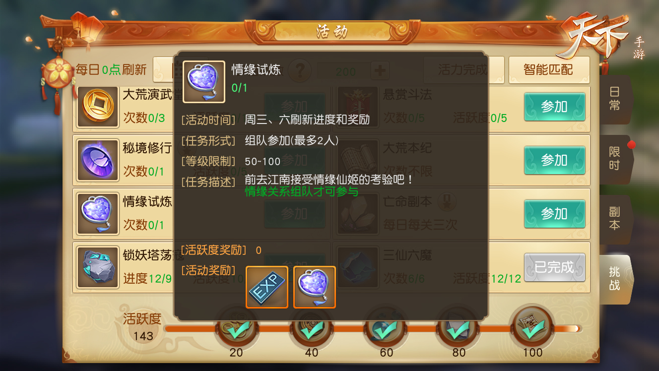 【爱你就一辈子守护你!《天下》手游情缘副本撒狗粮】真3D极致画面,无缝大世界,网易顶级品质旗舰《天下》手游孩子系统暖萌上线,正太萝莉任性培养!《天下》手游情缘专属副本情缘试练已经上线一周,少侠们有没有和情缘尽情撒狗粮啊!与你爱的人携手共闯难关,并肩获得超级奖励,这么好的机会千万不可错过呦!【情缘并肩共闯难关 超级奖励为爱点燃】《天下》手游已于全服开放情缘玩法——情缘试练,堪称天下最浪漫挑战之一!已经结为情缘的玩家可以组队参与,每周三和周六刷新,完成三轮挑战后可获得经验和情倾百年声望,百年声望可以在声望商店中兑换情缘专属称谓和时装呦!全新场景设计,挑战中处处充满了鲜花和爱心,让情缘尽情撒狗粮,不同关卡更是配上不同动态效果,随手截张图就是爱情大片!想和你的情缘一起虐狗?快来江南接受情缘仙姬的考验!【大荒传奇声震寰宇 新道具让你说给天下听】大荒传奇,声振寰宇!无论少侠是想向其他服务器的玩家,寄送祝福和思念,还是展示力量与威名,现在都可以成为现实!6月8日更新后,元宝商城上架道具声震寰宇。玩家可以通过购买并使用道具或直接进入原“天下号令”输入界面中“寰宇之声”分页,发送服务器之间最响亮的声音!寰宇之声本次共开放四种风格模式,包括“剑拔弩张”,“广而告之”,“节日祝福”,“千里姻缘”。选择对应风格及目标服务器并发送,您的内容将传送至对应服务器,用最酷炫的方式,展示给所有玩家!这天下,少年都在玩!在专属天地体验别样浪漫,快来和你的情缘一起来玩吧!寰宇之声就是让你成为传奇!