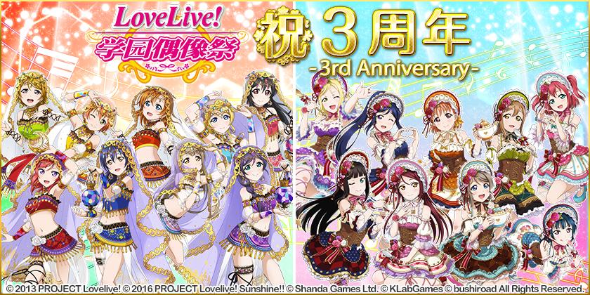 还记得那个夏天,九位怀揣着梦想的女高中生开始为成为校园偶像的不懈奋斗;还记得那个夏天,一声声“music start”激起你我的心中涟漪;还记得那个夏天,我们徘徊于地铁站间只为看一眼痛地铁的焦急心情;还记得那个夏天,参加全国大会时的紧张与激动。还记得三年前的那个夏天的6月12日,《Love Live!学园偶像祭》伴随着国内首辆二次元主题地铁:“Love Live!”来到了大家的身边。《Love Live!学园偶像祭》走过了整整三个春秋,《Love Live!学园偶像祭》迎来了它的三周岁生日,让我们首先祝《Love Live!学园偶像祭》三周年生日快乐!同时《Love Live!学园偶像祭》项目组、全体staff也感谢所有玩家对《Love Live!学园偶像祭》的支持与帮助!《Love Live!学园偶像祭》三周年纪念活动期间,我们准备了丰富多彩的活动,现在就让我们一起来看看活动内容吧。活动一:三周年特别登录奖励活动时间:2017/5/28 00:00 ~ 2017/6/11 24:00第1天除通常的登录奖励外,可额外获得[称号]浦之星女学院2年级 1个第2天除通常的登录奖励外,可额外获得[R]鹿角理亚 1个第3天除通常的登录奖励外,可额外获得[称号]浦之星女学院1年级 1个第4天除通常的登录奖励外,可额外获得[背景]楼顶[天灯] 1个第5天除通常的登录奖励外,可额外获得[称号]浦之星女学院3年级 1个第6天除通常的登录奖励外,可额外获得[背景]内浦海边 1个第7天除通常的登录奖励外,可额外获得[R]鹿角圣良1个※第7天的[R]鹿角圣良奖励结束后,特别登录奖励活动随之结束活动二:Aqours乐曲限定配信活动时间:2017/6/2 15:00?2017/7/1 24:00活动内容:以下Aqours乐曲限定配信:《Pops heartで踊るんだもん!》《空も心も晴れるから》《Waku-Waku-Week!》《Daydream Warrior》活动三:“我和《Love Live!学园偶像祭》的三周年”征文活动活动时间:2017/6/2 15:00 ~ 2017/6/11 24:00活动内容:大家可以私信官方微信、官方微博,写出“我与《Love Live!学园偶像祭》不得不说的故事”,我们会根据文章内容等因素进行筛选,选出十篇感人至深的文章。评选标准:1.字数超过500个字2.文章内容流露真情实感3.文笔流畅4.不得抄袭活动奖励:将根据文章内容选取10名玩家,每人获得loveca*10发奖日期:2017/6/13文章发布日期:2017/6/13~2017/6/22,每日发布一篇。活动四:三周年纪念登录画像、乐曲更改活动时间:2017/6/8 15:00 ? 2017/7/3 14:00活动内容:三周年纪念登录画像、乐曲更改画像 乐曲μ's 三周年記念画像 《HEART to HEART!》Aqours 三周年記念画像 《HAPPY PARTY TRAIN》活动五:连续3个月 赠送人气服装UR卡! 特别登录奖励活动时间:2017/6/12 00:00 ~ 2017/7/11 24:00第1天除通常的登录奖励外,可额外获得 Loveca 1个第2天除通常的登录奖励外,可额外获得 Loveca 1个第3天除通常的登录奖励外,可额外获得 UR特典卡“穗乃果” 1个第4天除通常的登录奖励外,可额外获得 Loveca 1个第5天除通常的登录奖励外,可额外获得 UR特典卡“南琴梨” 1个第6天除通常的登录奖励外,可额外获得 Loveca 1个第7天除通常的登录奖励外,可额外获得 UR特典卡“园田海未” 1个※第7天的 UR特典卡“园田海未”奖励结束后,特别登录奖励活动随之结束活动六:三周年限时登陆奖励活动时间:2017/6/12 00:00~2017/6/18 24:00第1天除通常的登录奖励外,可额外获得 [称号]:学园偶像祭三周年1个※第1天的 [称号]:学园偶像祭三周年 奖励结束后,特别登录奖励活动随之结束活动七:三周年限定礼包贩售时间:2017/6/12 00:00~2017/6/18 23:59【礼包详情】三周年Happy礼包 μ's:?Loveca (6颗)?SR以上招募券?μ's?(1张)?R 羊驼(3张)售价:25元※发售时间:6/18 23:59为止三周年Happy礼包 Aqours:?Loveca (6颗)?SR以上招募券?Aqours?(1张)?R 小香菇(3张)售价:25元※发售时间:6/18 23:59为止三周年纪念礼包 μ’s?11连优等生招募券 (1张)?SR以上招募券?μ's?(1张)?SR羊驼(5张)?[称号]:学园偶像祭三周年?μ's?(1个)售价:188元※发售时间:6/18 23:59为止三周年纪念礼包 Aqours?11连优等生招募券 (1张)?SR以上招募券?Aqours?(1张)?SR小香菇(5张)?[称号]:学园偶像祭三周年?Aqours?(1个)售价:188元※发售时间:6/18 23:59为止活动八:Aqours社员 — 9人新R卡追加決定!开催时间:2017/6/23活动内容:在优等生招募及普通生招募中,追加新规R卡9张(觉醒前:学园偶像社的练习服 觉醒后:「未熟DREAMER」舞台服)【追加卡牌】R高海千歌、R樱内梨子、R松浦果南、R黑泽黛雅、R渡边曜、R津岛善子、R国木田花丸、R小原鞠莉【衣装】(通常)动画「Lovelive! Sunshine!!」学园偶像社练习服?(觉醒)动画「Lovelive! Sunshine!!」第9話「未熟DREAMER」舞台服活动九:SchoolFes转校生4格漫画「转校生☆漫画~转校生庆典~」的连载开始!开催时间:2017/6/26 15:00活动内容:有着SchoolFes中登場的N卡转校生的新面貌4格漫画的连载开始!