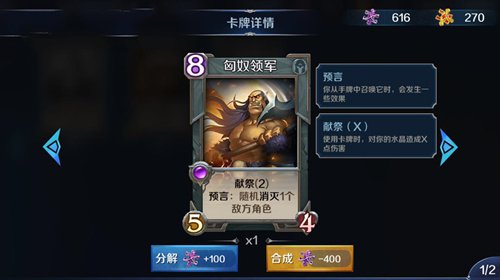 英雄战歌匈奴领军怎么样 中立紫卡大全,匈奴领军是英雄战歌tcg中的一张中立紫卡,过高的费用和身材并不匹配,但随即消灭敌人的效果在后期有很好的作用,推荐光系暗系等后期卡组携带。今天小编为大家带来的是游戏中匈奴领军的分析,希望对大家有所帮助。匈奴领军是目前十分强势的一张紫卡,作为8费的生物,显得有些笨重,而且身材也仅仅只有5/4,和6费的随从相当,但他的特效确实独一无二,可以随机消灭一个敌人,这在后期能够很好的赚卡差,同时赢得场面。当然,这张卡也有一定的问题,首先是消灭效果有时在处理遗言怪时很麻烦,比如独眼教官,杀了她还会让我们的水晶掉5滴血,或者对付佛印时,1/1护盾会成为难过的一道墙。其次就是自带的献祭效果,这在对抗一些速攻时上场会加速我们的灭亡。在这些方面,他就比不上红缨女武神了,红缨女武神也是上场去除一张卡,不过由于是移回效果,所以不会触发各类亡语,而且5费的她更加灵活,虽然攻击力只有3点,但节省的费用打出2点伤害还是绰绰有余的。尽管匈奴领军在很多方面还比不上女武神,但后期面对三阶英雄时,一张去除更为有效,不过目前节奏还是偏快的,因此大部分时候不能算是好卡。小编点评1、如果有红缨女武神的话,不建议合成2、如果两个都没有,建议优先合成女武神3、如果开出来的话,不建议分解4、后期卡组可以带一张,但不建议满编