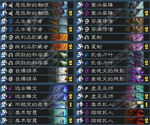 炉石传说火线突击乱斗卡组 复制傻子巨人法推荐 每周炉石乱斗是不少玩家们完成日常任务的重要依靠,那么什么卡组适合本周的火线突击乱斗?来看看适合规则的复制傻子巨人法!复制傻子巨人法卡组代码:AAEBAf0EAoK0AubCAg7AAfsBqwTdBNwK+wz3DYkOlQ/8D7sWhK0CmMQCxccCAA==卡组简介:主要利用了乱斗会无条件给予随从冲锋的嘲讽的规则,这样身材超模的傻子上场后会成为天然的嘲讽,而后期的奥术巨人的融合巨人会成为低费冲锋8-8,可用作后期斩杀。卡组使用策略:通常情况起手傻子必留,低费生物必留,奥秘、残影和高费牌不留 ;面对快攻乱斗职业:战士、盗贼、德鲁伊、骑士和猎人等,可注意留下1费触须和2费自爆羊 ,两者能用于冲锋自爆清场;面对其他慢速职业,可留过牌和冰箱。一般对局前期主要使用傻子和AEO随从抗住对手,并找机会使用法术、过牌和挂上冰箱。在面对快攻时可以用复制奥秘和残影获得更多的傻子嘲讽来消耗,面对慢速时则主要复制奥术巨人,因为我们只带了一个 ,且慢速不太可能将我们血线快速打到10 血以下。后期就比较简单,基本上打快攻时利用红巨人冲锋反杀,打慢速时则主要用奥术巨人斩杀。注意点:1当先谢娜和张杰,如果可能先在头上挂上复制,免得对手偷冰箱,或者准备两个冰箱 ,一旦敌人偷了复制则小心别让对手将谢娜被复制。2.当心萨满和法术的妖术和变形 ,面对这两个职业是优先用残影复制巨人 ,而不是用奥秘,防止巨人变成小羊和青蛙。3.面对牧师,特别是心火傻子牧时,小心其可能会带群体驱散,这张卡会令我们傻子嘲讽全部无效 ,这样或许被对手需要偷鸡,一个墙的时候也要注意单个沉默。卡组优势对局: 傻子嘲讽+冰箱苟活强力,可抗快攻;后期辅助巨人成功后,能靠4个8攻巨人打出OTK,因此打后期也不占劣势,总体卡组较万金油;劣势:可能被反奥秘针对卡克制 ,或者出现操作失误,因为理论上我们的后期斩杀是绝对足够,前期挂上冰箱后就很难死。